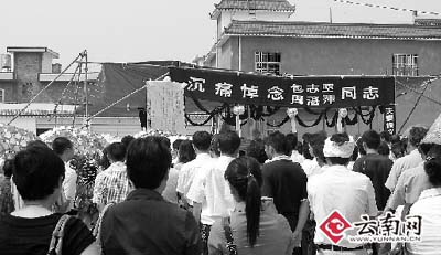 昨日上午11点,包志坚、周湛萍的追悼会在盈江县人民医院新家属小区内举行,来自社会各界的上千人自发前来沉痛悼念,不时有单位、个人的花圈送抵现场。
