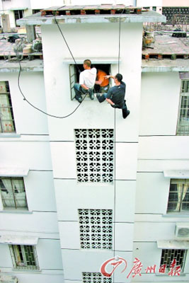 昨日下午,一名男子在佛山市禅城区岭南大道一居民楼威胁要跳楼,佛山市、区两级公安机关及消防部门经劝说未果后,采取行动,两名特警从天而降,滑至窗口位置将该男子牢牢控制住,联合消防队员一起强行将其救下。