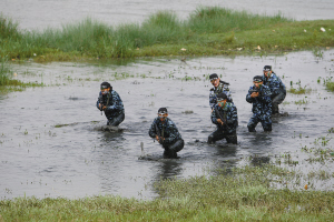 4月9日上午10时许,从湛江某地一处僻静的港湾里,突然传出一阵阵震天的吼声———“绝对服从”!只见15名身穿蓝色迷彩服,身背制式长枪,脸上涂着迷彩,裹着黑色头巾的年轻人,每5人一组,合力扛着3根各约400斤重的圆木,在港湾边上的泥泞里跋涉。