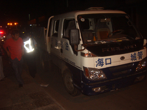 昨日,海口交警支队事故处理大队的陈警官说,“车上印有‘行政执法’字样,且是1.25小型卡车。根据目击市民的反映,我们连夜对海口城管部门的行政执法车辆进行排查。”
