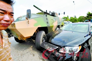 昨天下午2时30分,在107国道新塘路口经典酒店门口处,一辆轮式装甲车与一辆价值百万元的凌志轿车相撞。车祸造成该路段的拥堵。同时,另外一辆轿车和一辆大货车行经此处因避让不及也撞上了。