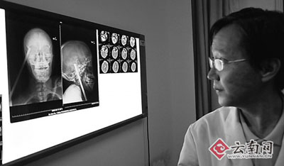 记者从院方了解到,小贺是头外伤右肘部贯通伤,从X光片上可以看到,约长为8厘米的钢筋刺进头颅,目前有生命危险。由于不能确定头颅内血管受损的情况,院方不敢轻易取出钢筋,只有先请消防人员分别将刺进手臂和头颅部分的钢筋截断,进行止血等分别处理、规避各种风险后,制定出最佳的方案才能实施手术。(记者 何谨)(春城晚报)