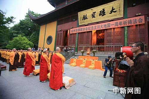 中新网杭州5月12日电(记者 柴燕菲 见习记者 周翌)一年前的今天,巴蜀大地一声长叹,举国旗半落以致哀,笛长鸣以悲怆。一年后的今天,巴蜀大地重获新生,如凤凰涅磐。一年来,汶川的阵阵喘息,步步前进都牵动着全国人民的视线。2009年5月12日16时30分,杭州市佛教界各大寺院300余僧众会聚千年古刹灵隐寺,隆重举行汶川大地震一周年祈祷法会。