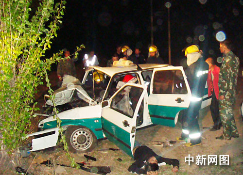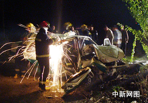 零时43分,双鸭山市”119“指挥中心接到报警称,双七公路双富村路段发生一起严重的交通事故,车上多人被困请求支援。记者从现场救援的尖山消防中队了解到,消防官兵赶到事故现场发现,一辆夏利出租车冲出公路撞到路旁的大树上,驾驶室严重变形,现场一片狼藉,已有3人被救出送往医院,仍有4名人员被卡在车内。