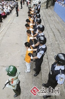 昨天下午1点30分,公判大会在富民县闹市区富民电影院门口准时召开,露天会场戒备森严,会场拉起警戒线,会场内外、周围街道上站满执勤民警,9名头戴钢盔荷枪实弹的民警、武警分别站在会场内维持秩序。
