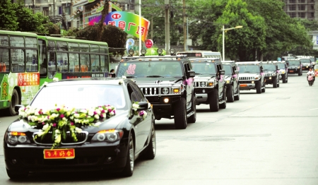 奔驰越野车作为拍摄车,主婚车是一辆宝马7系轿车,后面跟着的则是12辆扎着粉色气球的悍马H2……昨日上午,这支婚车队伍在成都合江亭一亮相,立即引起众人的惊叹,市民纷纷掏出手机和相机拍照。有人算了一笔账,这支豪华婚车队伍的车辆价值上千万元,实属难得。