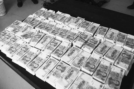 5月11日下午6时许,民警把两名犯罪嫌疑人王某和赵某(系罗某次子)抓获,在两个编织袋中共起获HB90版百元面值假币250万元。