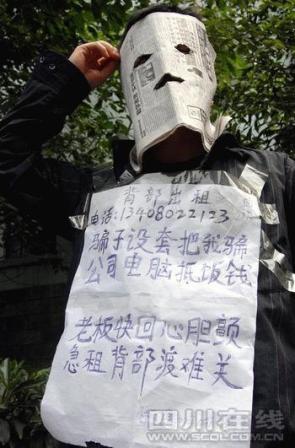 昨(18)日,一自称上当受骗后荷包干瘪、欲挣“快”钱赎回典当物的男子,挂着一块“背部出租”的牌子出现在闹市区。“又在作什么秀?”该男子的出现,引来不少市民围观议论。曾幕后策划了“公开招丫头和夫人”、“最美丑女征婚”的、号称“资深策划人”的仁寿县人王江与提供此线索的报料人也同时出现在现场,不禁让人怀疑这是王江的又一次炒作。
