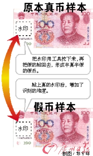 犯罪嫌疑人采用挖补方式,将真币的水印挖出来后,用胶水粘贴到假币当中,原来的真币则填充上假的水印,填充上假水印的真币也成了假币,“这样100元就变成了200元,嫌疑人造出假币后就马上到柜员机存入假币,再到另一个柜员机取出真币,继续伪造。”
