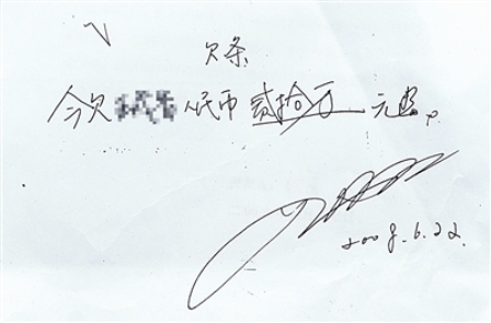 拿到钱后,雅晖写了张欠条:“今欠老婆人民币二十万。”楚楚开始没有细看,隔了两天,又觉得不妥,找了个合适的机会提醒了雅晖一下,“他把老婆改成了我的名字,但是签名是用的艺术签名,一共有8条弧线,我实在没认出来,不过我想以后都快是夫妻了,还计较这些干什么呢?”