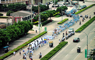 昨天下午1时20分左右,海丰县城华夏花园住宅小区里走出一队阵容庞大的送殡队伍,先是数十辆摩托车鱼贯而出,上了马路后一字排开将一边路面堵住,不让车辆通过,为送殡队伍让出了一条道来;接着是敲锣打鼓、抬花圈、扛挽幛的人,孝子孝孙披麻戴孝抬着灵柩,后面是一大批送殡的亲戚朋友,一律打着太阳伞、佩戴黑袖圈;紧随其后的是7辆豪华小车,多是奔驰、奥迪等名牌车。送殡队伍排出了约1公里的长龙,从海丰县二环路徒步走到海城美食街,再转至红城大道,摩托车队一路“维持秩序”,确保送殡队伍畅行无阻。直到海丰县海城镇政府附近,丧主亲属坐上中巴,将灵柩送往火葬场火化,整个送殡过程持续约40多分钟。