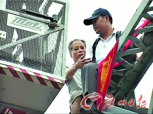 事情在12时15分出现变化。此时,在警员的多番劝说后,跳桥者依然坚持坐在铁架上。正当大家都束手无策的时候,一名老伯走了过来,向警方自荐要去劝说跳桥者。