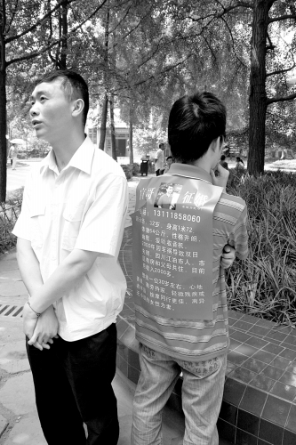 虽然是公开征婚,但王先生和曾天华都显得很腼腆,不怎么说话。倒是跟在他们身后,戴着墨镜、背着大牌子的红衣男子更受人关注。他就是几天前在街头出租背部的黄某。曾天华出了100元钱租用他的背部一天,让其背着广告牌子,为征婚造势。