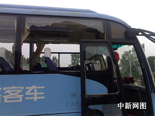 中新网长沙5月26日电(雷坤平 肖前辉)26日中午,两司机为抢客源在邵(阳)怀(化)高速公路上引发打斗,一王姓客车驾驶员伙同他人对另一唐姓客车驾驶员在高速公路上大打出手,致使唐姓驾驶员受伤,车前挡风玻璃和车窗被砸烂砸坏。