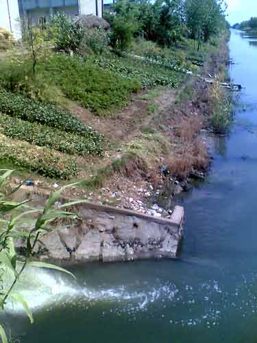 记者顺着指引,沿这条战备河而上,走不多远,终于在盛家村发现了一片绿水与乳白色交融的水域。河东岸桥头一簇芦苇的后面,一股污流正呈90度角泄入河中。通过观察水面泡沫的走向,记者发现这股污水正潜向不远处的水厂取水口。