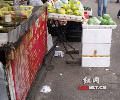 当时,邻居——水果店的男老板也在摆放水果,他将几箱水果摆在了靠近烧饼摊一侧的路中央。但由于“烧饼帅哥”生意兴隆,人多,所以水果店老板摆在路中央的几箱水果使得路人和车辆通行很不方便。