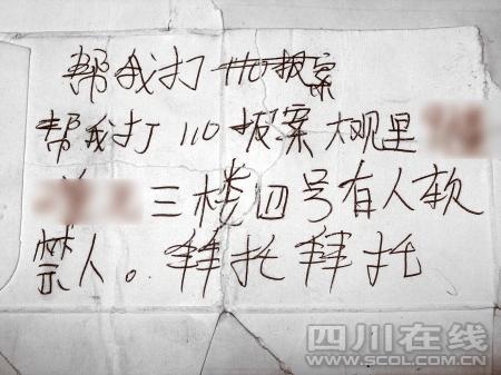 “帮我打110报案……有人软禁人,拜托拜托。”昨日下午2点,家住成都大观里某小区的一位大爷正在小区内散步,突然,一张硬纸条歪歪扭扭地从三楼窗户飘落下来,大爷拾起一看,大吃一惊,立即将纸条交给小区门卫。5名警察接警后立即出动……