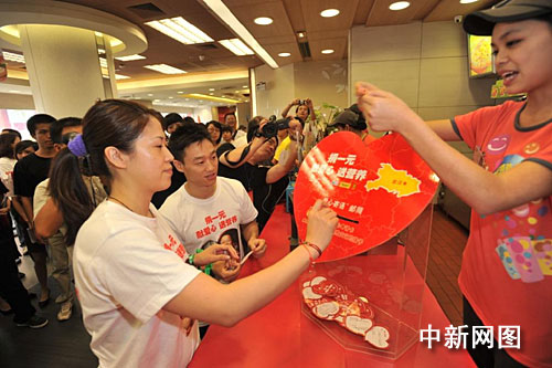 中新网武汉6月1日电 (徐金波 朱文丽 郑文君)在湖北籍奥运冠军杨威、高崚的倡议下,荆楚大地1日再次掀起向地震灾区小学生“捐一元,献爱心送营养”募捐行动,号召全社会每人捐一元,用于为更多的灾区小学生提供为期一年的每日营养加餐。