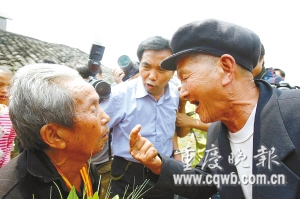 “刘东娃(刘召回的小名),让我摸摸你头顶的伤疤,好没有?”只见一位年龄相仿的老人挤进人群,将双手罩向了刘的后脑,拨开层层白发,抚摸着一道一寸来长的疤痕惊喜地说,“没错,就是东娃!你头上这道伤疤,是我们一起下河摸鱼时摔伤的,你还记得不?”