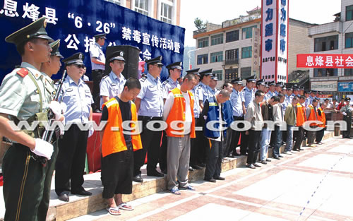 6月3日,(贵阳市)息烽县召开公捕、公处大会,对罗某、胡某等17名涉嫌毒品犯罪、“两抢一盗”的嫌疑人依法进行公开逮捕和公开处理。据悉,该县群众安全感从2004年的86.67%提升至去年的94%,位居贵阳市前列。