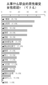 如今,从事什么职业的男性最受女性欢迎?调查中选出的十大职业为:IT精英(45.1%)、公务员(37.9%)、医生(35.6%)、律师(29.5%)、老板(29.3%)、自由职业者(23%)、事业单位职工(21.9%)、教师(21.4%)、军人(20.5%)、学者(17.4%)。