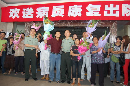 下午三点半,9名已康复的伤员在医务工作者和家属的陪同下走出了外科楼。四川省卫生厅副厅长赵万华与该医院部分领导向伤员们赠送了鲜花,并握手、拍照留念。