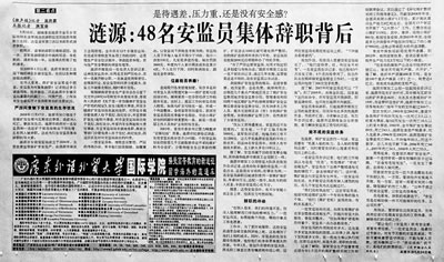 5月22日,湖南省《湘声报》刊登《湖南涟源48名安监员集体辞职 待遇不如矿工》。3天后,《中国青年报》刊发《涟源:48名安监员集体辞职背后》。两篇报道如投放在舆论涡流中的重磅炸弹,一时间,网络上的相关评论铺天盖地,传统媒体也迅速跟进,舆论沸腾了。