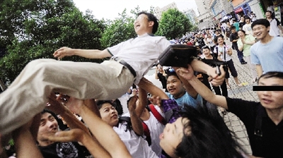 高考最后一门英语结束了,对紧绷的高三学生来说,这是一个欢乐的时刻,轻松的时刻。周南中学十几名高三学生,刚走出长沙一中考点,便将班主任吴老师举起抛向了空中。