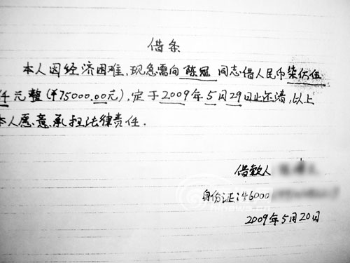 小锋给记者看3张借条复印件,记者在5月20日小锋向阿冠所写的借条上看到:本人因经济困难,现急需向阿冠同志借人民币75000元,定于今年5月29日止还清。借条最下角是小锋的签名手印画押。随后5月22日和5月24日的另两张借条,放贷者另有其人,分别借款1万元和45000元,还款期限都为7天。