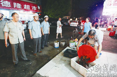 8时许,记者随洪山区执法队来到图书城路,远远便看到几处烧烤摊上空烟雾缭绕、气味呛鼻,一家油焖大虾店外,五六张餐桌横亘在人行道上,桌上虾壳堆成小山,桌下污水横流。“老板,你这样出店占道经营违反了市容管理规定,请你配合一下,把桌子收到店里去吧。”“进去哪有生意做?”劝说、宣传无效,50名执法队员围站成一圈,双手背在身后,沉默地注视着食客和坐在一旁的老板。如此“对峙”了27分钟后,两桌食客先“顶”不住了,草草结账离去,老板与另两桌食客又“坚持”了片刻,最终悻悻地收拾起桌椅搬进了店内。