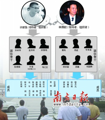 许建强为首成立了“闸坡鸿发水产品购销部”等一系列公司,以暴力、胁迫等手段实施故意杀人、故意伤害、敲诈勒索、强迫交易和非法收取保护费等违法犯罪行为,垄断了阳江部分地区的海鲜、冰条、螺仔、三鸟、沙石、煤气、客运、运输物流市场。林国钦为首则成立了信诚寄卖行等一系列公司,同样以暴力、胁迫手段实施了故意伤害、强迫交易、非法经营等违法犯罪活动,基本垄断了阳江的水泥销售市场,在追收非法债务过程中,逼迫他人以山林、厂房抵债,大肆掠夺他人或企业财产,甚至导致有的企业破产倒闭。阳江地区的社会稳定及经济发展受到了严重影响。
