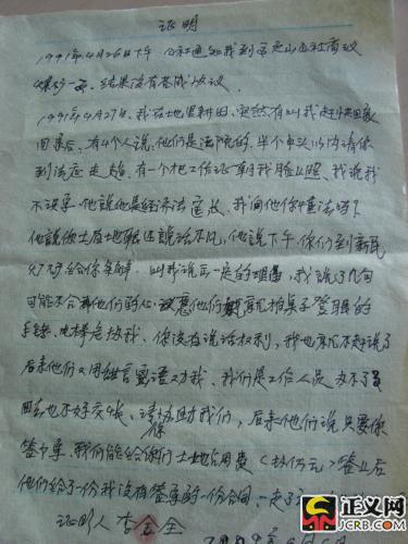 但事情到后来却发生了变化——6月13日,再次来京的两位举报者带来了李金全,李金全说:记者采访时,自己介绍的其他情况都是真实的,但签字一事没有讲真话。在调解书上,自己是签了字的。以前,记者采访时在这个问题上之所以没有说实话,一是担心承认自己当初经不起法官的威胁和引诱,在损害集体利益的调解书上签过字,村民们会瞧不起他这种软骨头。二是怕记者不敢碰硬揭露本案的内幕,想以否定自己签字的假情况引起记者重视。但如今记者要发稿了,为了对事实负责,所以愿意说出当时的真实情况。