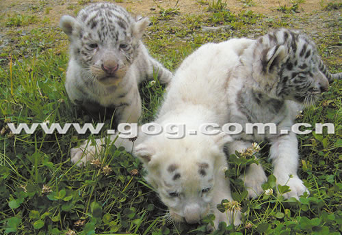 据介绍,2006年4月,该园从杭州野生动物园引进一雄一雌两只白虎(毛皮白色,间杂棕色条纹),2008年9月23日,雌虎第一胎便产下了包括一只浑身雪白没有条纹“银虎”在内的三只小白虎。