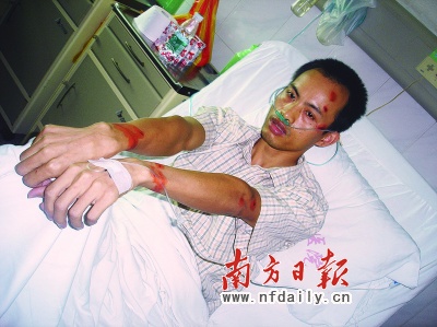 昨日下午,记者赶到三水区人民医院住院部,伤者韦奕庆正躺在病床上打吊针,他鼻子里插着氧气管,左额、太阳穴、眼角及下巴等多处涂着紫药水。