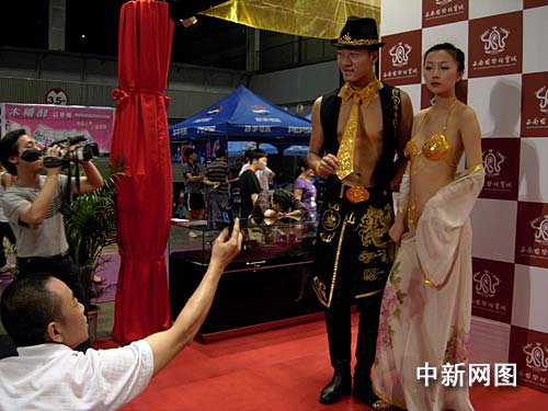 中新网重庆6月27日电 (姜诚意) 27日,在此间举办的重庆婚博会上,一名醉意熏熏的男子借着酒意,在内衣女模面前大胆越界拍照,甚至企图手摸女模展示的天价黄金内衣,吓得模特花容失色并停止了展示。