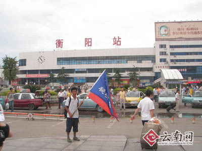 当天一大早,杨世和、杨泽勇父子就起了床,整装扛上宣传旗专程到了衡阳火车站,他们一边照相留念,还不忘使命:宣传云南,宣传临沧和云县。据杨世和介绍,他们一路上吸引了不少地方媒体的关注报道,特别是进入湖南郴州,当地的郴州电视台派出了好多记者围追堵截采访父子二人。这一路上父子俩心情都很好,不仅能浏览到各地风景,还能完成家乡父老的重托。但最让父亲杨世和心痛的是,一路上的酷热天气,特别是进入湖南以来的太阳很烤人,儿子杨泽勇出现了中暑症状,他自己也感觉不舒服。这是他们一路上遇到过的最大困难。