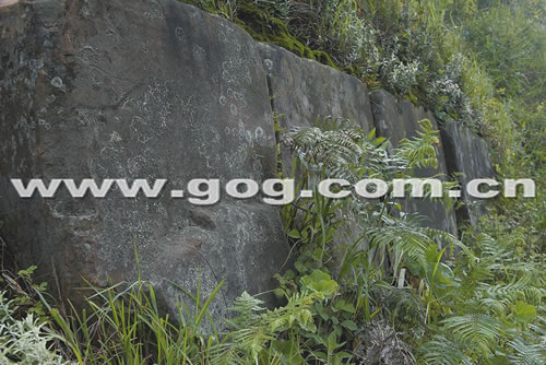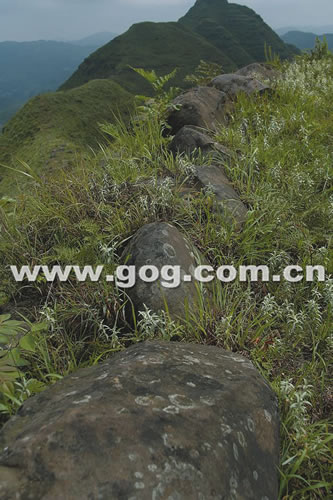 类似的排列巨石一直向东顺着山脊两侧像长城一般蜿蜒近一公里,并且呈现出一定的排列规律:山崖南面堆砌的巨石体积巨大,且都是具有明显的人工开采和打磨痕迹长方形或正方形石块;而山崖北面的巨石几乎都是未经打磨过的石块,呈不规则形状,并且在堆砌时不及南面巨石那样讲究和规整,但同样是一线排开。在山峰腰部茂密的草丛中,同样有一些整齐排列的巨型方石,且山腰还残留有人搭建的石阶。