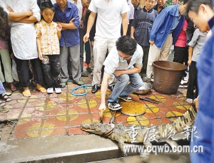 昨下午,綦江县桥河社区阳光幼儿园旁的人行道。一条一米六七的鳄鱼被两小伙合力抓尾巴拖出铁笼,一把铁钳夹住鳄鱼颈,铁锤敲头、尖刀割喉……就这样,本性凶残的鳄鱼在五六十人围观下,被杀死肢解,吓得不少小朋友蒙眼,胆小的成人失声尖叫。