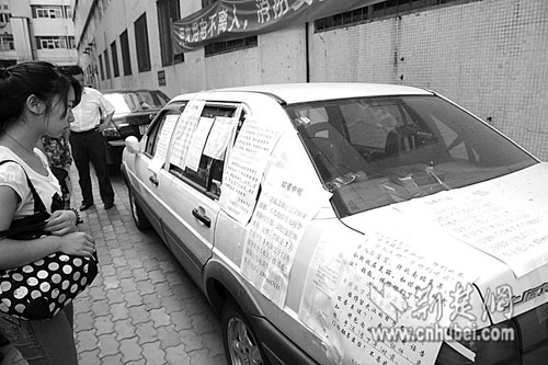 昨日,在汉口协和医院内,一辆贴满“告示”的白色桑塔纳汽车,引来不少行人驻足观看(如图)。“告示”称:“请梁上君子遵守职业道德……数万元现金供你们享用,但请把包里的卡、证件、票据等物于7月7日下午3时前,交于门诊部导医台……本人不胜感激!请用公用电话告知……”