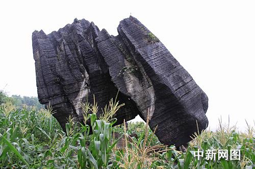 记者在长宁县梅硐镇中坪村看到,这两块“奇石”紧紧依偎连在一起,岿然不动地耸立在一块玉米地中间的石灰石上,成60多度角向南倾斜;每块“奇石”高10米左右,周长在12米以上;“奇石”底部与地面出露的石灰石基岩并未“生”在一起,而是像放在上面一样。南(左)面的那块石头要“矮胖”些,与地面有两个接触点;北(右)面的则“苗条”些,与地面只有一个接触点。
