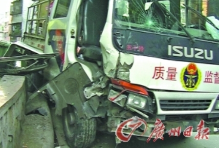 记者在现场看到,一辆车头标有“质量监督”字样的五十铃汽车斜靠在路边护沿,车头底盘受损严重,右侧车门撞车后脱落路边。距五十铃十米远处,五辆停在路边的面包车和轿车尾部被撞凹陷。