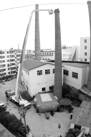 中年女子的弟弟乘上消防的举高云梯靠近女子进行劝说。女子的弟弟使用喊话器喊话告诉姐姐不要做傻事。可是失去理智的女子根本听不进去。见弟弟与救援人员靠近,中年女子就站在烟囱上大喊,“谁也别过来!再靠近我就跳下去!”由于女子所处位置非常高,风力较大,为保证女子安全,云梯又降了下来。消防官兵将救生气垫展开铺在烟囱下,防止女子坠下。