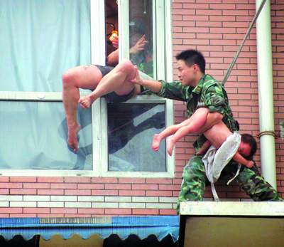 张婆婆讲,8时30分许,她就看见该男子抱着娃娃坐在窗台上,好多次都欲往下跳,她的心一直悬着。男子不时挣扎,让娃娃的整个上半身向下倾斜,每当这时,娃娃都会用自己的小手使劲抓住窗户,惊得围观群众齐声尖叫。