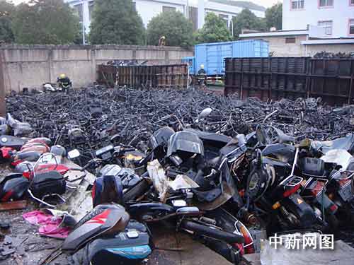 中新网宁波7月8日电(何蒋勇 欧阳峰)7日下午5时50分许,位于浙江省宁海县兴宁中路45号的宁海县物资再生利用有限公司发生一起火灾,浓烟冲天达百余米高,整个宁海县城都能清楚地看到黑烟滚滚。当地消防部门先后出动四辆消防车、近四十余名官兵参与火灾扑救,约40分钟后成功将大火扑灭,但是该公司露天堆场内近百辆废旧摩托车被大火烧成骨架。