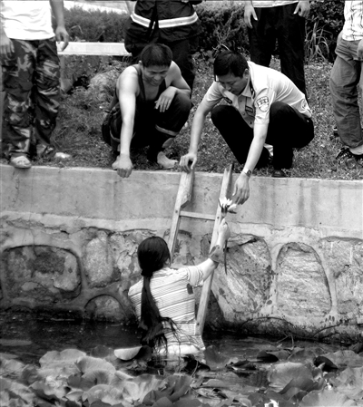 女子把放在水里的衣服重新穿上,在消防队员的协助下爬了上来。她在上岸之前,还顺便从河中摘了一朵莲花献给警察,以示“感谢”(右)。