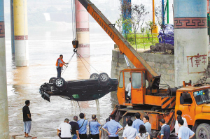 上午11点半,3艘渔船终于合力将沉入水底的轿车拖至码头。轿车在水中已经翻了个4轮朝天。13点过,这辆牌照为渝AQ9823的黑色轿车被吊车吊出水面,一个挎包紧贴着车窗,但车内没有那名女子的踪影。记者看到,车身严重擦伤变形,车头保险杠脱落,除了后挡风玻璃不见外,四门车窗全都紧闭,与熊先生描述的熊林从打开的车窗逃生细节不符。警方从车厢内找到了一个黑色旅行箱、一个白色大挎包和一个黑色小提包以及散落的化妆品和相关证件。