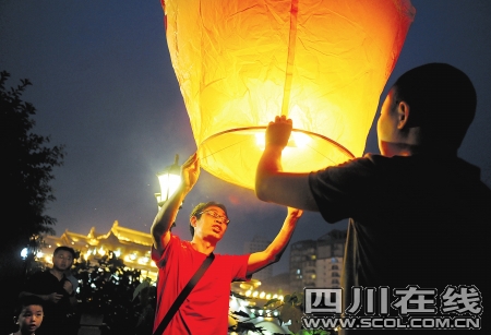 晚8点,合江亭边天色还未全暗,“范跑跑”身着红色T恤、休闲短裤和一群艺术家安静地坐在竹椅上等候。8点30分左右,德籍华人艺术家蔡青招呼众人,《祈愿》正式开始,范跑跑径直走向安放孔明灯的纸箱旁。“我们的孔明灯是从台北邮购过来的。除了要用孔明灯为地震逝者祈愿,还寓意海峡两岸人对生命的尊敬。下面我和范老师将共同放飞孔明灯,愿意参与的市民都可以加入。”蔡青是此次活动的主要发起人,作为常年旅居国外的德籍华人艺术家,蔡青说多次前往映秀、北川等灾区,大片废墟令他很震惊。蔡青点燃孔明灯后,邀请“范跑跑”和他共同扶住灯的底框,将高达1米左右的孔明灯逐个放飞。
