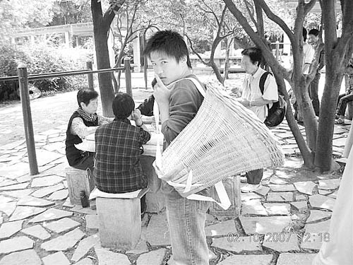 他的背篼,有自己身高的一半那么长,每次放上五六十斤重的大米、粮油,走上差不多两里地,顶多能赚5元钱。每天,这个大学毕业生和贵阳街头的其他“背篼”们一起,躲在瑞金北路能避雨遮阳的沿街屋檐下,或者在华联、沃尔玛一类的地方蹲点,平均一天挣不到20元。