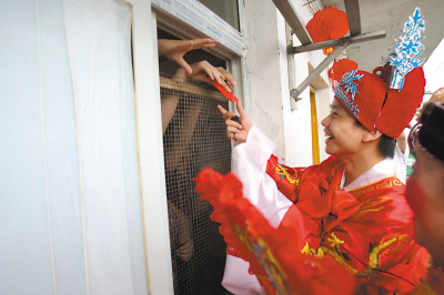 昨日8:30,十余名穿着古装的年轻人,抬着花轿、提着元宝、骑着大马,来到渝北区沙坪镇新华工业园。原来这是一对新人的古装迎亲队,所有人穿着整齐的长袖长袍,等待着新娘。随着锣鼓乐声,身穿红色古装长袍的新娘,被新郎抱进了花轿。“起轿!”媒婆喊道。6名古装女子举起“迎亲”的牌子前面开道,后面跟着两名男孩各提一箱元宝,随后的新郎骑着棕色的大马“护航”。