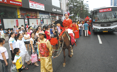 昨日上午,渝北一新郎骑马迎新娘,前面6个古装女举牌,后面跟了轿子及25米长的车队,走了两个多小时。为沾喜气,路人纷纷要喜糖,甚至过往轿车也停车要喜糖,造成两路闹市道路缓堵。由于天气热,迎亲者纷纷解开长袍,新郎则在马上摇起蒲扇。交警部门称,这支迎亲队伍骑马又占了行车道,双重违规难逃罚款。